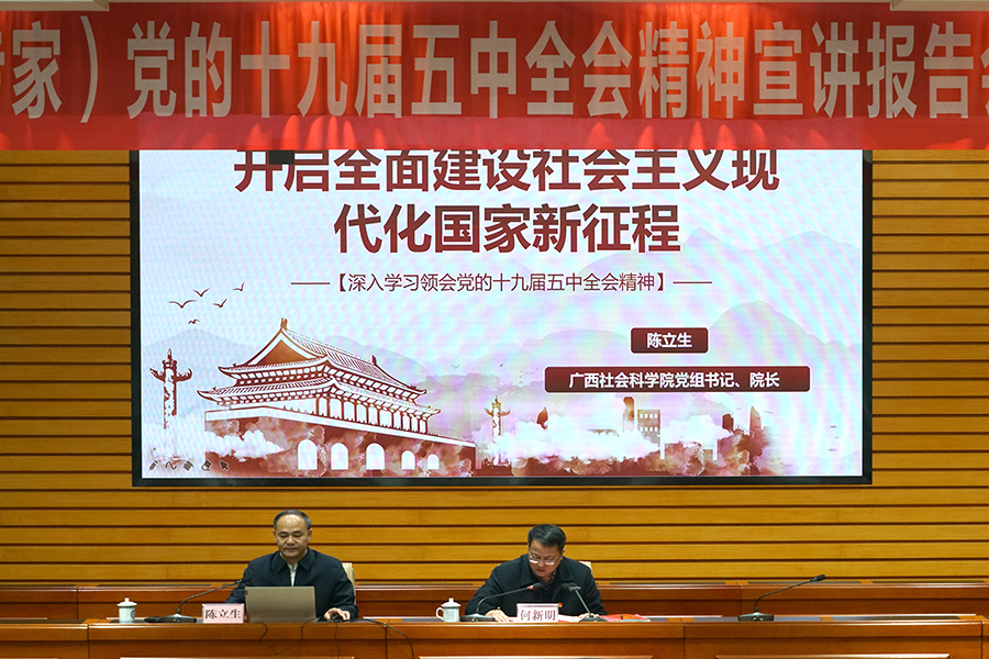 11月27日上午,自治區(qū)黨委講師團黨的十九屆五中全會精神宣講報告會在臨桂新區(qū)工委會議室舉行。廣西社會科學(xué)院黨組書記、院長陳立生作了題為“開啟全面建設(shè)社會主義現(xiàn)代化國家新征程”宣講。臨桂新區(qū)工委第一副書記、管委會主任、臨桂區(qū)區(qū)委書記何新明主持報告會,并作臨桂新區(qū)黨的十九屆五中全會精神學(xué)習(xí)動員講話。
