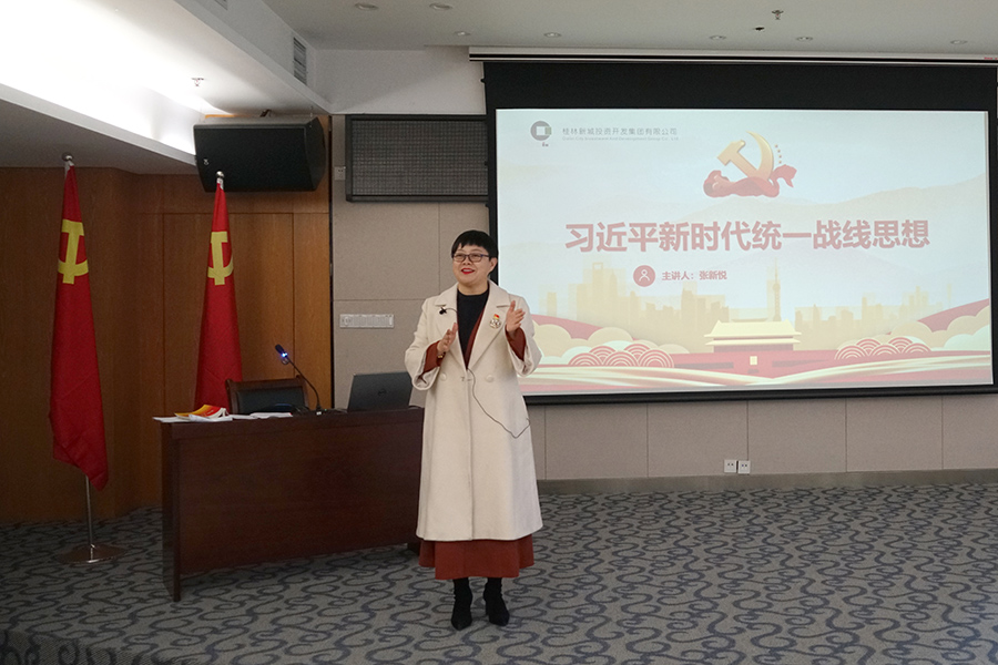 2020年12月31日,桂林新城投資集團黨總支統(tǒng)戰(zhàn)委員張新悅以“習(xí)近平新時代統(tǒng)一戰(zhàn)線思想”為主題,給集團公司第二黨支部黨員、發(fā)展對象、入黨積極分子,分管部室、子公司負責人上了一堂專題黨課。