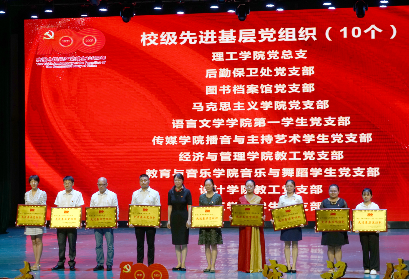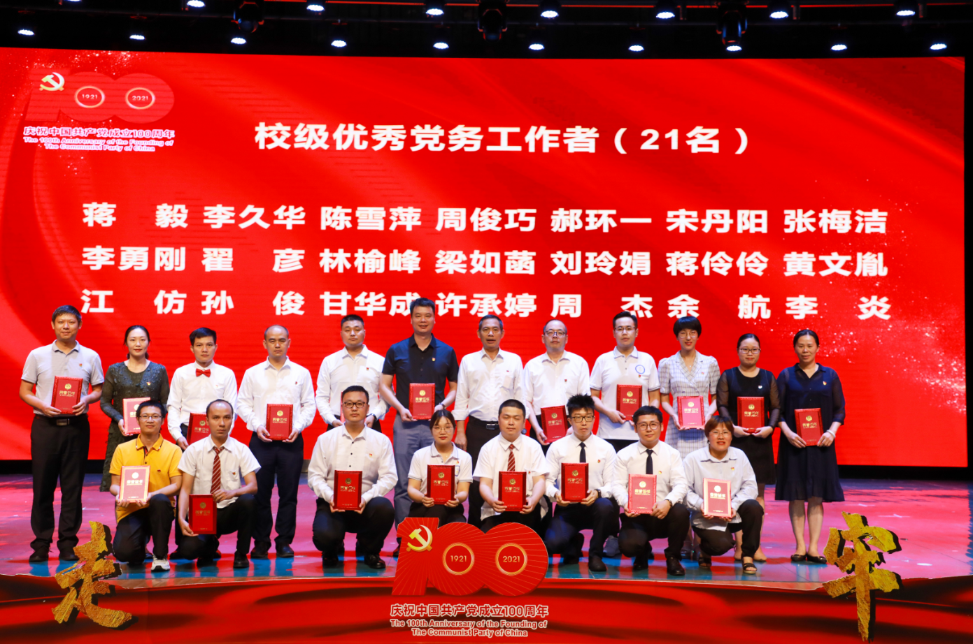 隨后,黨委書記唐文紅,校長楊樹喆等為新黨員代表佩戴黨徽、贈送黨史學習教育書籍;為優(yōu)秀共產(chǎn)黨員、優(yōu)秀黨務工作者和先進基層黨組織獲得者頒獎;為學校2019-2020年度“至善之星”團隊和個人獲得者頒獎。