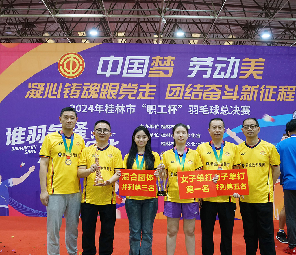 4月27日下午,由市總工會(huì)主辦的“中國夢(mèng) 勞動(dòng)美 凝心鑄魂跟黨走 團(tuán)結(jié)奮進(jìn)新征程”桂林市“職工杯”羽毛球比賽圓滿結(jié)束并舉行了頒獎(jiǎng)儀式。新城投集團(tuán)羽毛球隊(duì)經(jīng)過激烈角逐,在36支參賽隊(duì)伍中摘得多項(xiàng)榮譽(yù):由公司黨委副書記(主持工作)、副董事長、總經(jīng)理朱毅擔(dān)任領(lǐng)隊(duì),吳萍明、龔志祥、楊衛(wèi)來、張欣婭、唐蒙組成的新城投集團(tuán)“黨旗映勝地”羽毛球隊(duì)榮獲團(tuán)體第三名;張欣婭榮獲女子單打第一名;楊衛(wèi)來榮獲男子單打第五名的優(yōu)異成績。