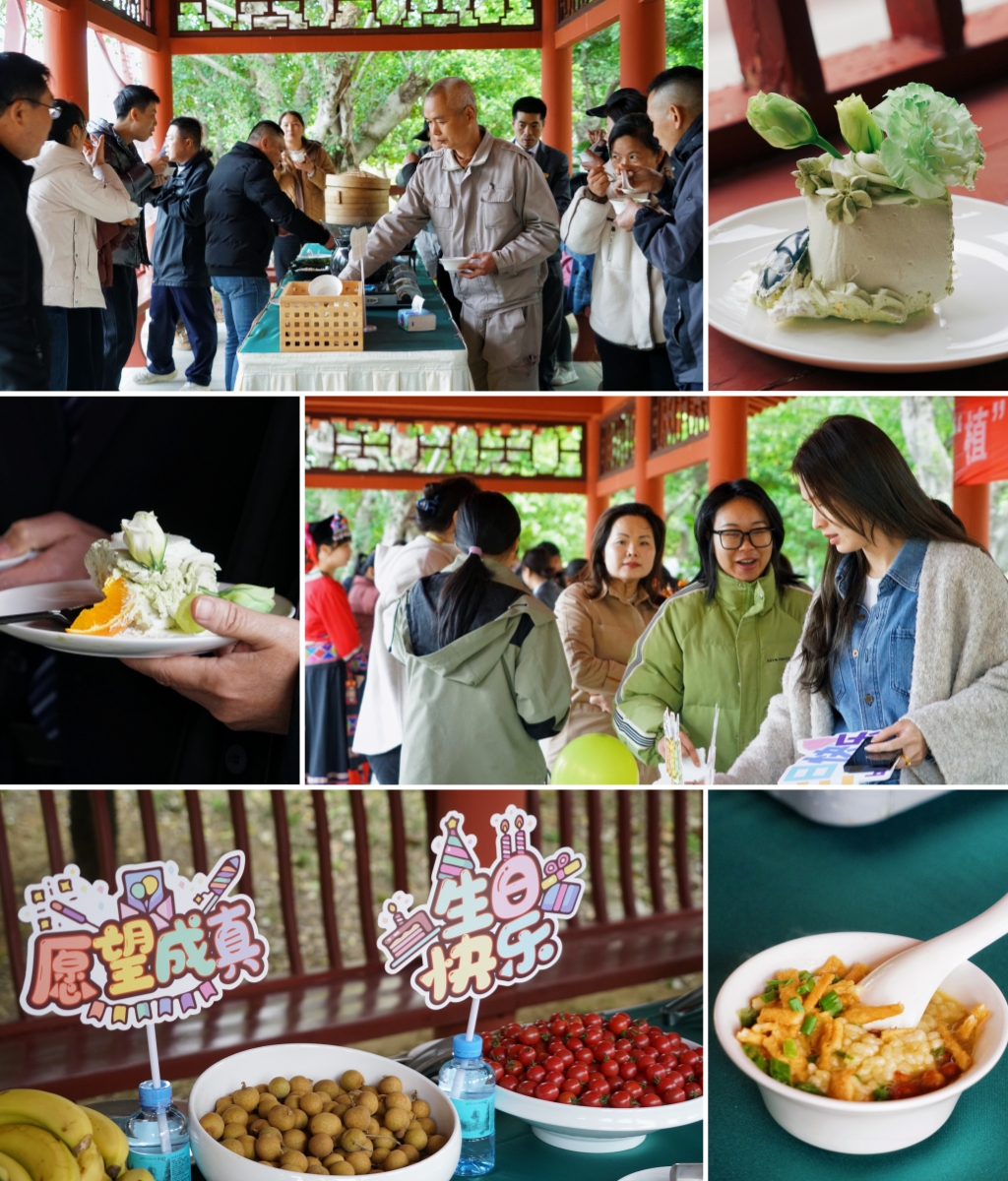 在茶歇環(huán)節(jié)中,弘毅亭長(zhǎng)廊早已擺放著各種精美的點(diǎn)心、水果、飲品,以及桂林傳統(tǒng)非遺“Chinese Coffee”——油茶體驗(yàn)區(qū)。油茶香氣四溢,搭配著甜蜜的蛋糕和繽紛的茶點(diǎn)飲料,讓這場(chǎng)集體生日會(huì)充滿(mǎn)了溫馨與甜蜜。大家圍在一起,品嘗美食,交流心得,歡聲笑語(yǔ)不斷,情誼也在這一刻悄然升溫。隨后,所有人品嘗了由宏謀酒管公司精心制作的生日蛋糕,一同共唱生日歡歌。