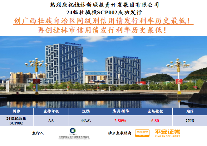 2月2日,桂林城鄉(xiāng)建設(shè)控股集團有限公司旗下桂林新城投資開發(fā)集團有限公司成功發(fā)行2024年度第二期超短融,規(guī)模4億元,期限270天,票面利率2.80%,認(rèn)購倍數(shù)6.80倍,本期超短融由平安證券獨立承銷。此次成功發(fā)行超短融再創(chuàng)桂林市信用債發(fā)行利率歷史最低,也是廣西壯族自治區(qū)同級別超短融發(fā)行利率歷史最低!
