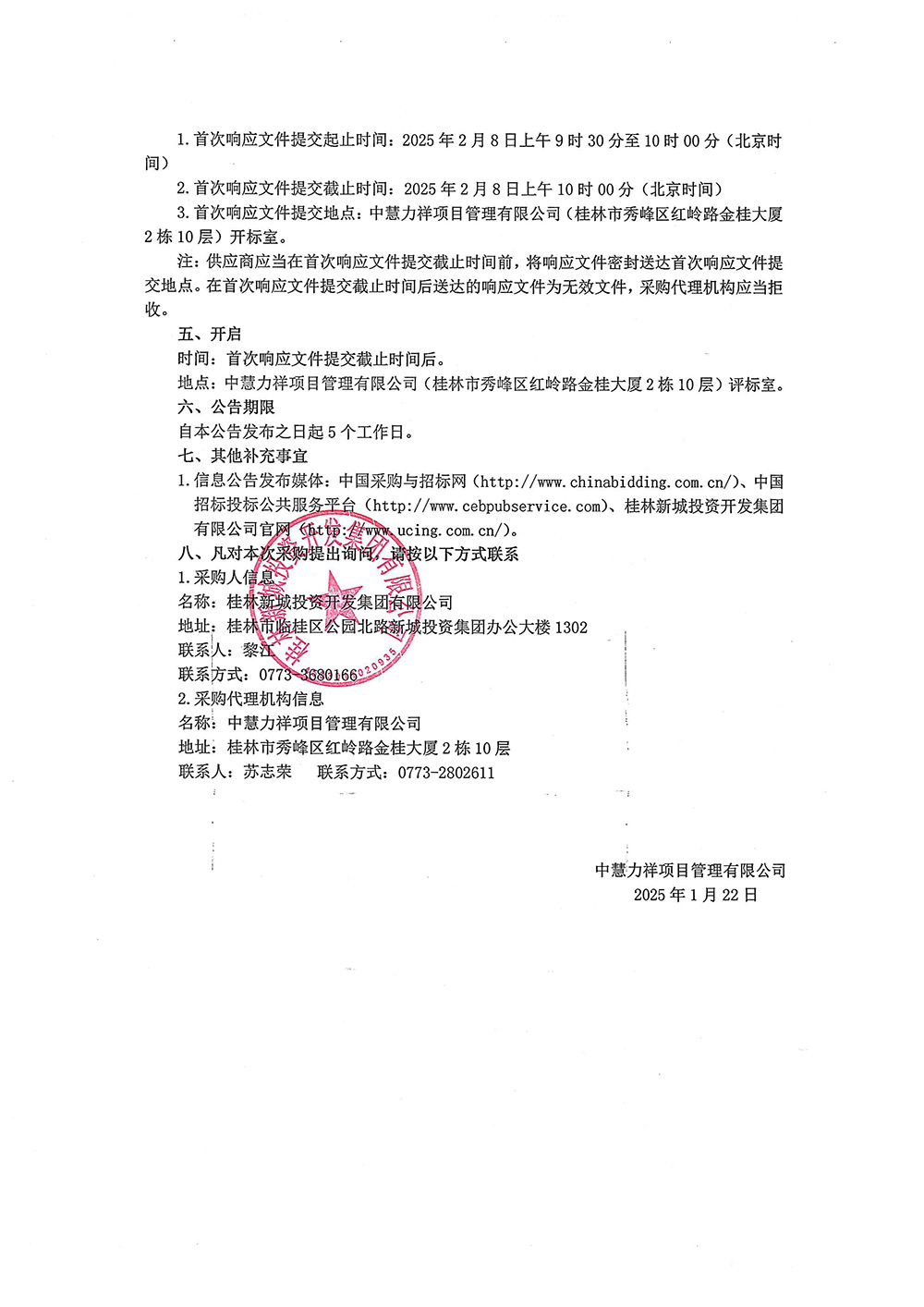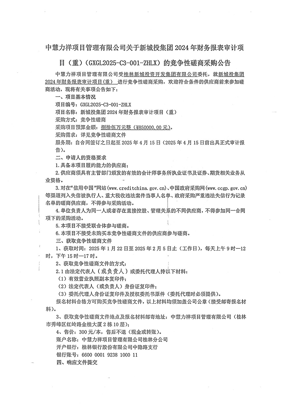 中慧力祥項目管理有限公司關(guān)于新城投集團(tuán)2024年財務(wù)報表審計項目(重)(GXGL2025-C3-001-ZHLX)的競爭性磋商采購公告